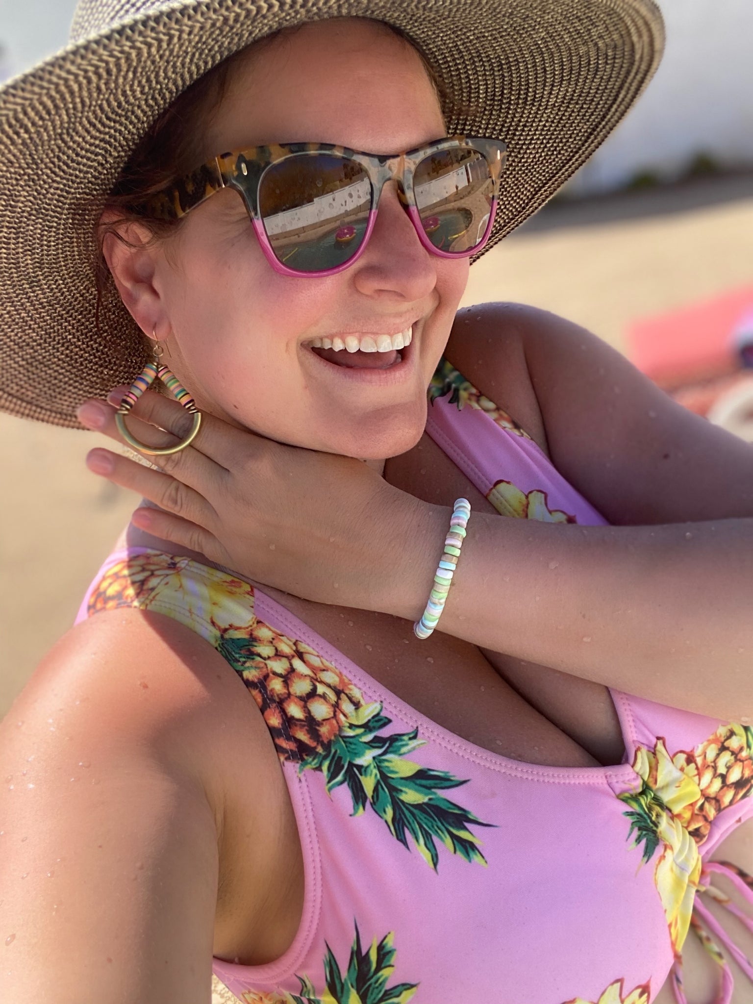 Handmade in Brooklyn, NYC. Candy colored opals are hand strung and interspersed in this bright beaded boho bracelet. Brass beads and a gold fill clasp closure finishes this nicely weighted fun piece. 6.5 inches in length and adjustable up to 7.5 inches.