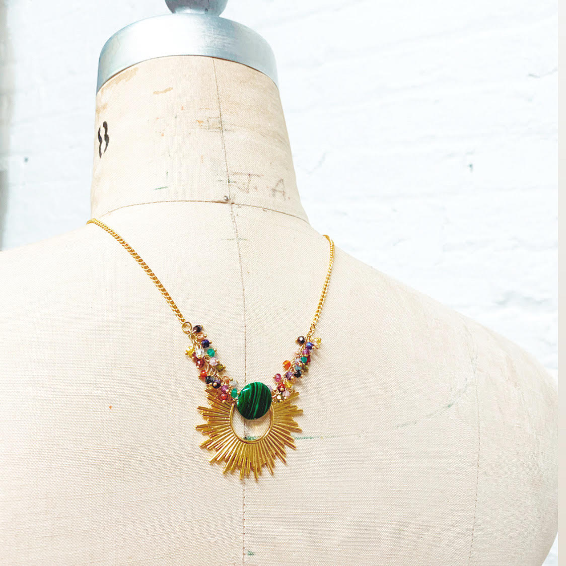 Handmade in Brooklyn, NYC. This malachite sunburst pendant is handmade and measures about 2 inches across. A subtle statement worthy necklace, length is customized at checkout. Shown at 20 inches.