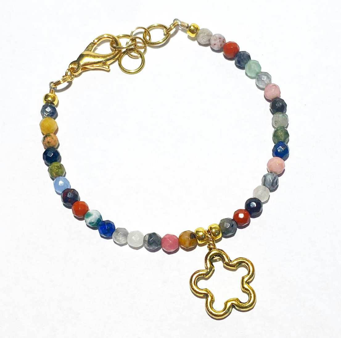 Handmade in NYC. Welcome Fall with this Autumn Bracelet stunner. Handcrafted with a seasonal mix of gemstones, all selected with intention. A brass whimsical flower charm hangs from the center of this beaded charm bracelet, reminding us of natures bounty during the Fall. 6 3/4 inches adjustable up to 7.25 inches. Clasp closure. Please see the matching necklace for a cute jewelry set!