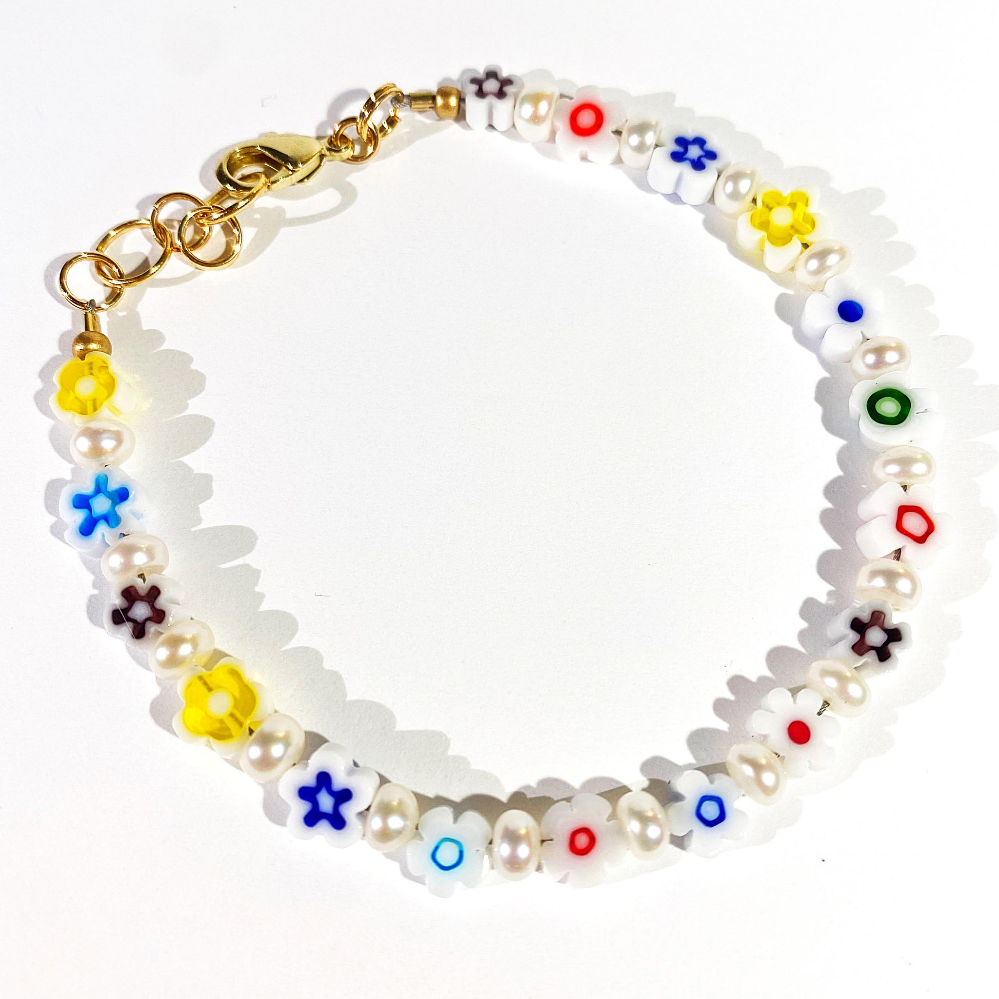 Handmade in NY. Sweet, joyful, multi colored daisy beads are paired with upcycled itty bitty pearls (rescued from a large broken vintage necklace!) in this dainty beaded bracelet. Adorable on its own or worn in a stack, bracelet measures 7 inches and is adjustable for the best fit.